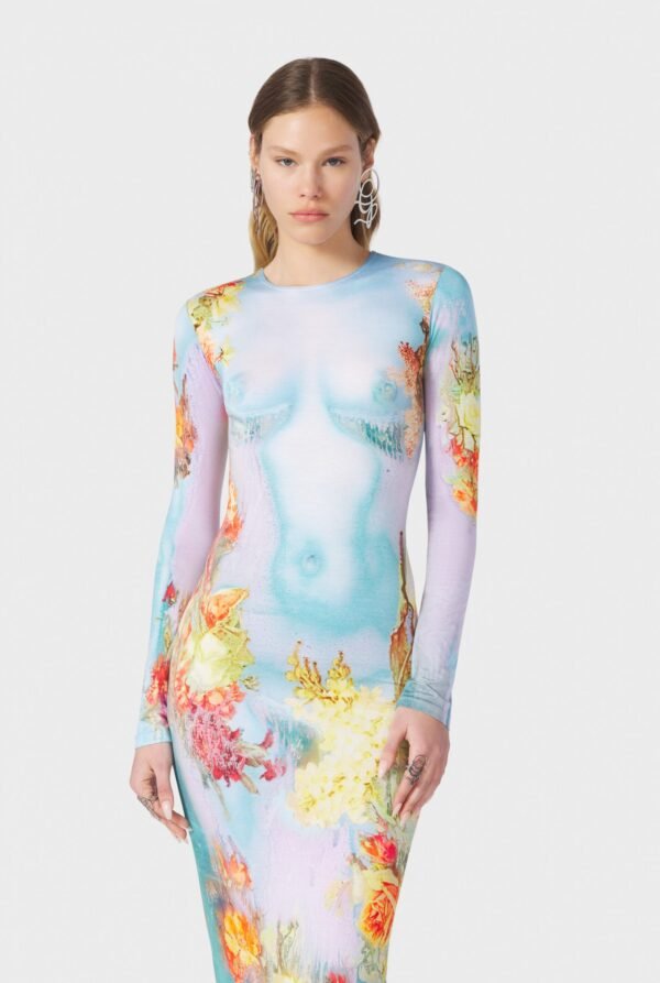 The Blue Body Flower Dress by Jean Paul Gaultier is a sleek, form-fitting long dress featuring a striking trompe l’œil floral body print. Designed with a crew neck, long sleeves, and a stretchy fit, it offers both comfort and bold visual appeal. Made from a viscose blend, this statement piece exudes modern elegance with an artistic edge.